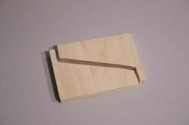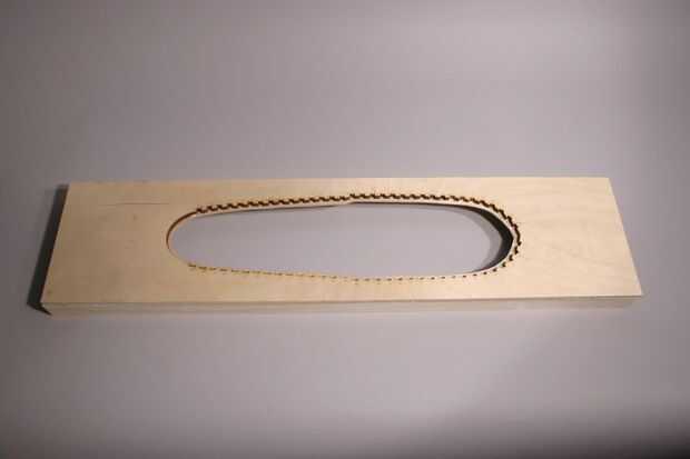 La razón lo tuviera corta la madera contrachapada a la mitad fue hacerlo más fácil cortar las muescas. Un borde de la madera se utiliza para alinear la línea central del patrón de plantilla. Después de que las muescas se recortan según el dibujo de la plantilla, las dos piezas son empalmadas juntos y pegadas. Para fortalecer esta base, piezas de 2-1/2 "x 1/2" hobby Álamo (se encuentra en las tiendas de mejoras para el hogar como Lowes o Home Depot) se pegan alrededor del perímetro de la base como se muestra en las fotos.