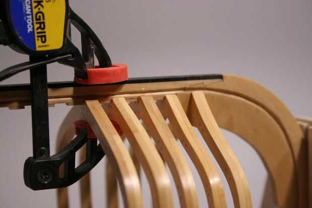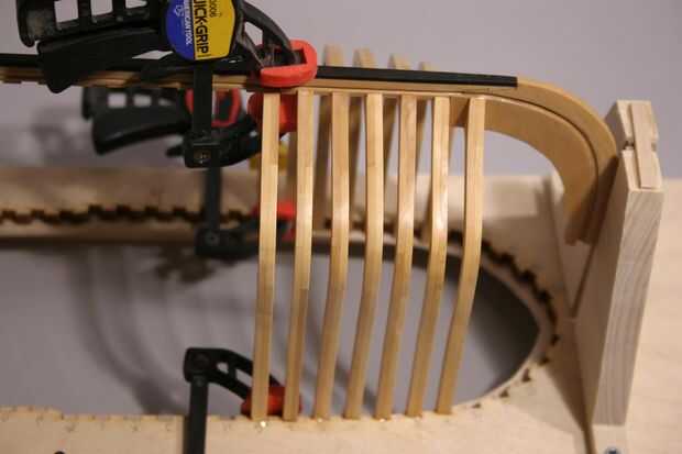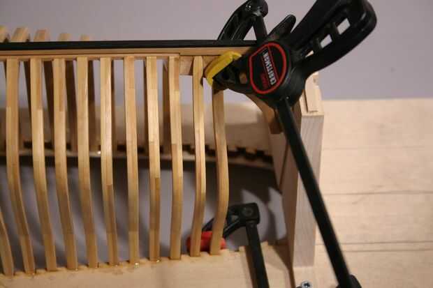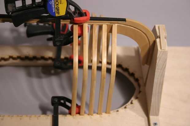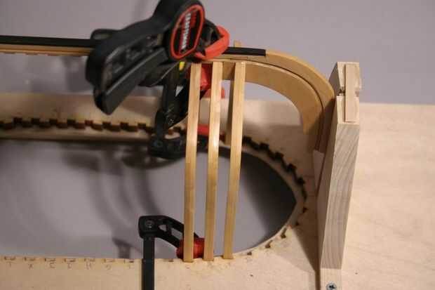 La secuencia de fotos muestra la instalación de los marcos en la plantilla de construcción. Me gustaría comenzar con la instalación de las primeras y la últimas imágenes completas y luego rellene el área entre ellos. La razón es que el marco de la primero y la último entonces proporcionará el soporte de la quilla en ambos extremos mientras se agregan los otros marcos.