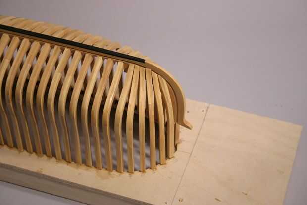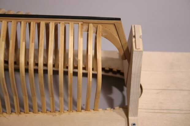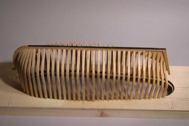Una vez que todos los marcos se instalan, como se muestra en la última foto, se quitan las mordazas a proa y popa simplemente quitando los tornillos. Esto le da fácil acceso a todo el casco cuando se va hacia fuera. Pero antes de que el casco puede ser carenado, el espejo de popa popa debe enmarcarse. Cubriremos el proceso en el siguiente paso de estas instrucciones.