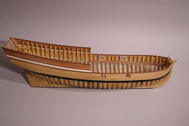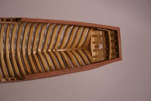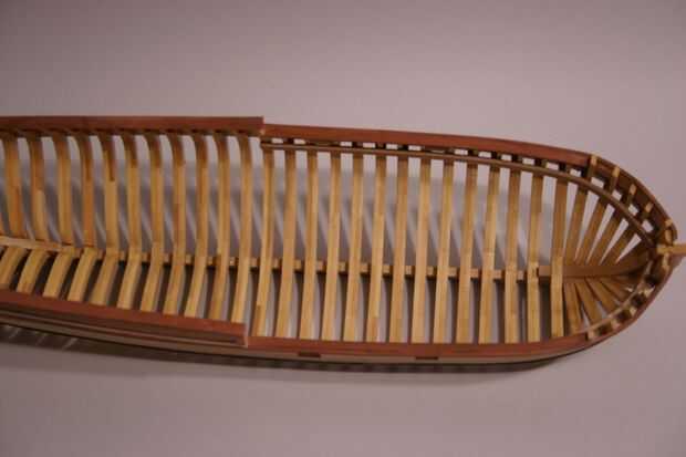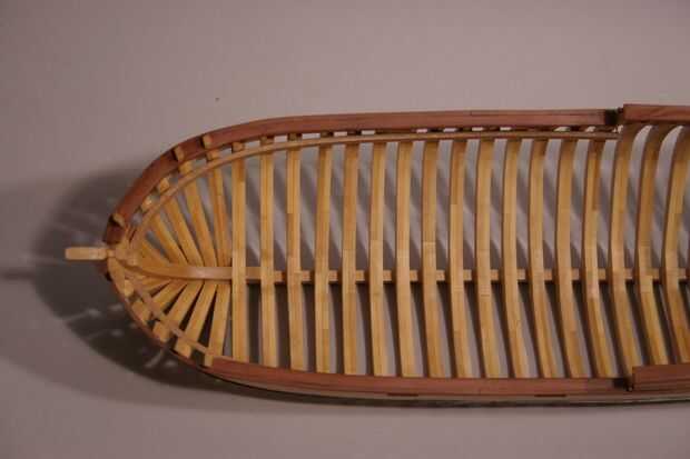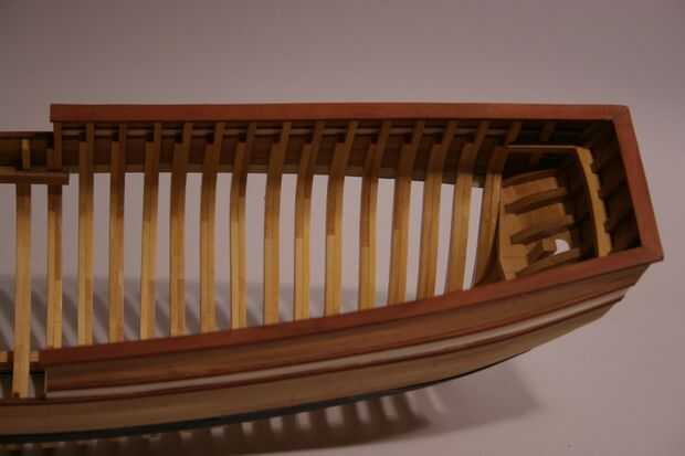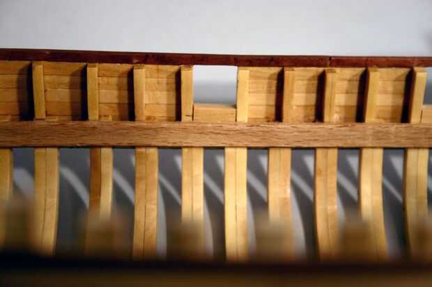 Porque el casco ya ha sido entablonado, será más difícil recortar los marcos de lo que era antes. Sin embargo, se me ocurrió una manera de hacerlo que hace mucho más fácil. En la 1er foto pueden ver que he instalado la abrazadera de la cubierta. Se trata de una franja de 1/16 de pulgada (. 062") x 1/4" (. 250") madera. Necesitará sumergirlo en agua para hacer la curva en el arco, o usted podría capa con dos tiras de madera de 1/32 "x 1/4". La abrazadera de la cubierta soporta las vigas de cubierta que se agregará en el paso siguiente. Tilo es más suave y se dobla más fácil así que te recomiendo que la uses para las abrazaderas de la cubierta.