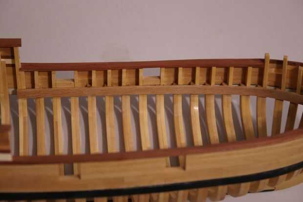 Para completar la tapa del carril en el arco, cortar trozos de su tapa carril tira madera que encajan entre los primeros 2 cant Marcos dejando estos timberheads expuestas sobre el carril de la tapa. Estas piezas son sólo tan amplia como los marcos. Corte otra tira de entre canto Marcos 2 y 5. Esta pieza debe quedar encima de los marcos de 3 º y 4 º cant. Luego cortar un pedazo pequeño para caber entre el 5 º marco cant y el tallo.
