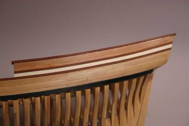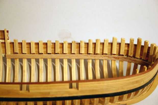 Para acabar el carril de la tapa, una franja de 1/16" cuadrado suizo Peral se pega al borde exterior del carril instalado de la tapa. (Esta pieza se puede hacer de una pieza de corte madera tapa carril a. 062" x. 062"). Esto bloquea el carril de la tapa con el timberheads en el arco y forma un carril que se compone de tres capas de madera - la moldura exterior, el carril sí mismo y otra interior de piezas de moldeo. Las fotos restantes en este paso muestran los carriles de la tapa rematada.