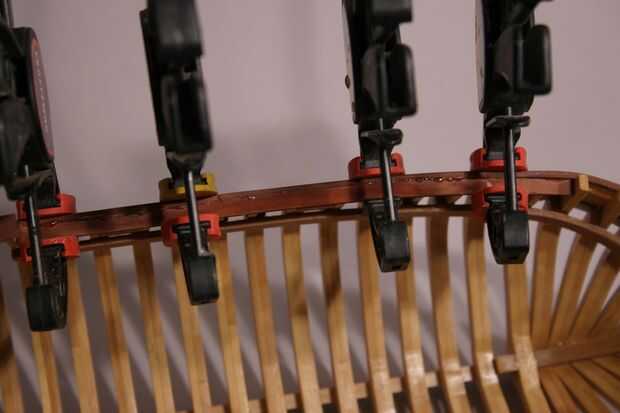 El área alrededor de la cubierta principal es un poco más difícil trabajar con debido a la curvatura del casco en la proa. Pueden utilizar abrazaderas para sujetar el riel de la tapa hasta que el pegamento se seca.