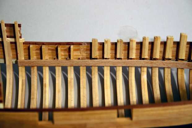 Aviso que dejé el casquete del carril donde no se marco la primera comienza. Esto es porque hay maderas que se extiende por encima del tapa carril llamado timberheads. Éstos fueron utilizados para atar algunos de los aparejos. Usted debe hacer las piezas del nuevo medio marco marco cant 1, 2 y 5 más de los otros.