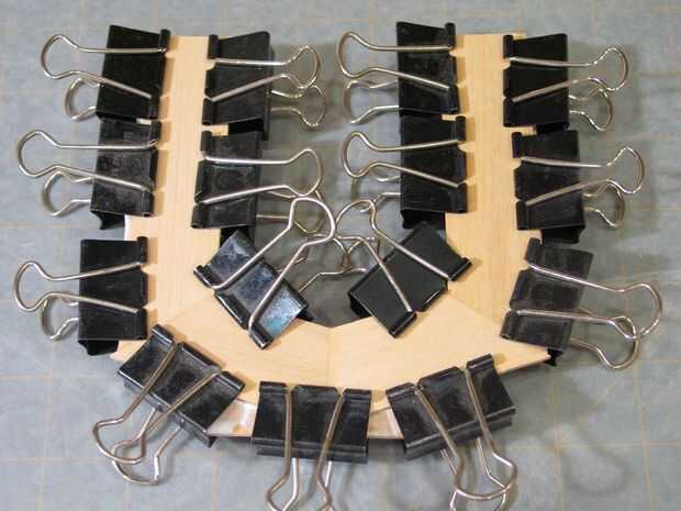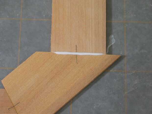 Las capas se pegan para arriba por separado. Cuando el pegamento se ha dado suficiente tiempo para secar, limpiar el exceso de pegamento en la superficie, raspando la lo lija no. Luego unir las dos capas como se muestra en la foto 6. Como se puede ver, la capa superior tiene un empalme en la zona centro de la parte inferior, y se centra sobre la otra capa que carece de tal articulación. Esto no es sólo por el diseño pero también representa cierta exactitud histórica. La capa con el fondo de centro común representa la primera madera futtock y la parte superior. La capa sin esta articulación representa la planta y la segunda futtock que conforman un marco completo. Sólo una pequeña trivia para usted. Habrá un control más tarde! Es broma.