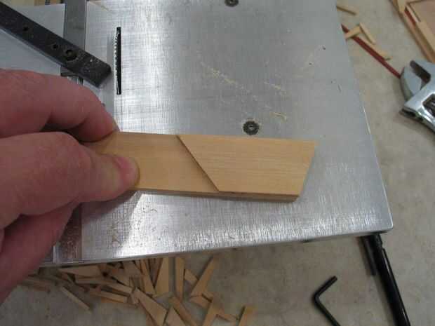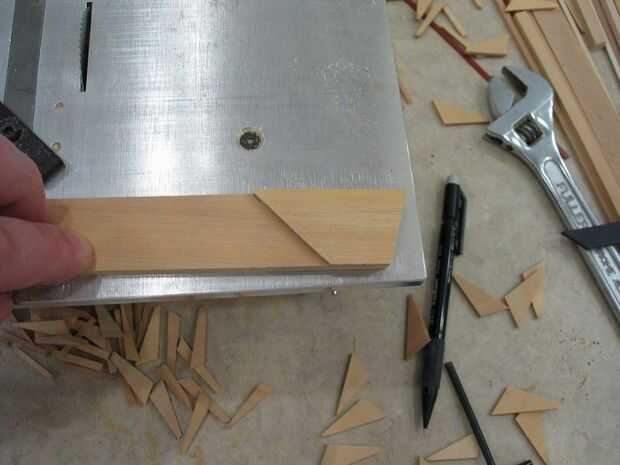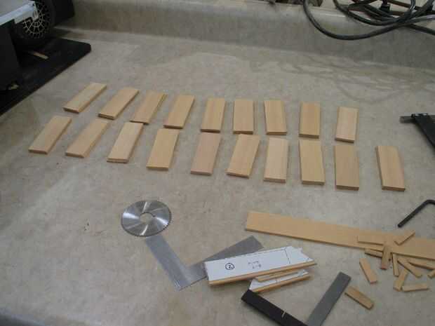 La madera de estas capas será. 125" de espesor. La anchura de las piezas del marco en blanco es 1". Es una sola tira de material en blanco del capítulo 24" de largo para que todos de las piezas para una mitad de un marco se ajustan en el material blanco del marco. Eso significa que usted necesitará aproximadamente 68 tiras para hacer los marcos, pero para este paso, sólo necesita 46 como cubro los mitad Marcos y sus espacios en blanco en otro paso.
