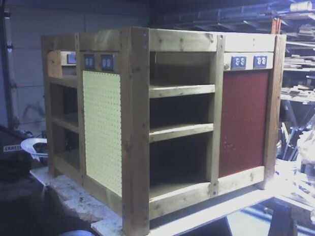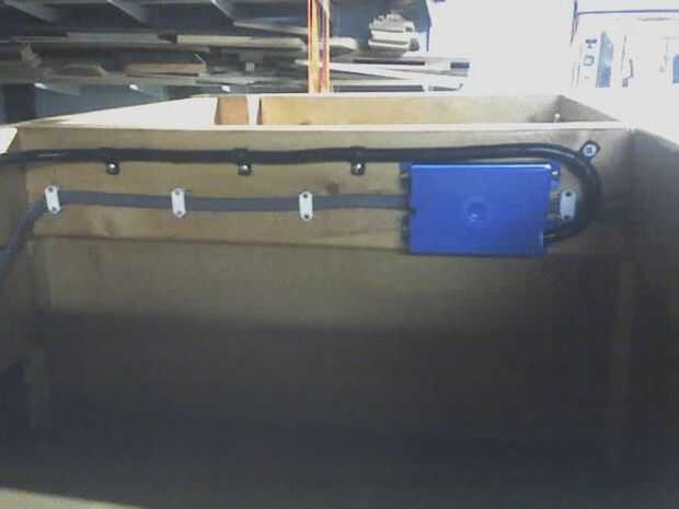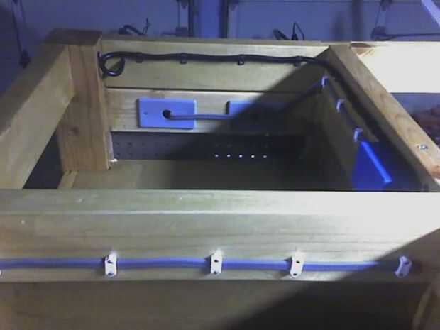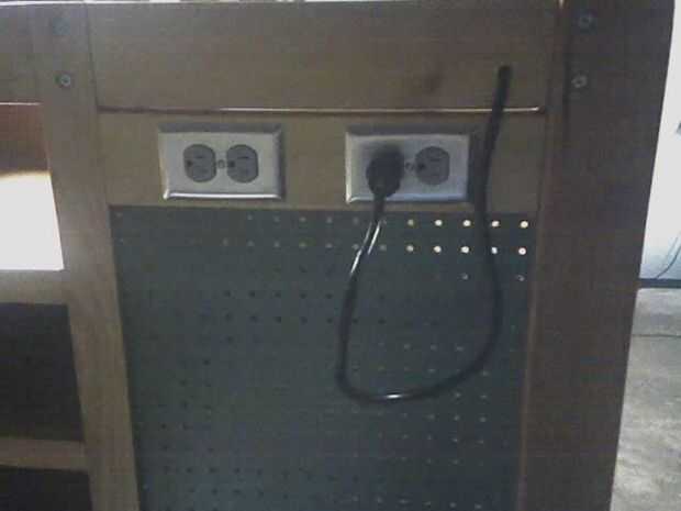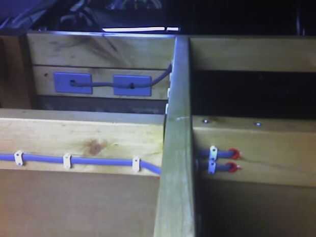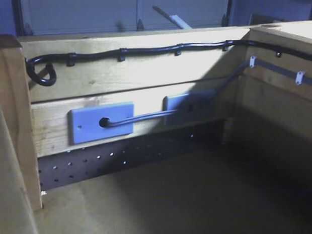 Una caja de conexiones eléctricas debajo de la parte superior de uno de los centros de montaje transversal. Pase los cables a cada salida. Conecte todos los cables en la caja de empalmes. Una colita de cerdo cuelga en el exterior de la tabla se utiliza para alimentar todas las salidas de energía de la casa.