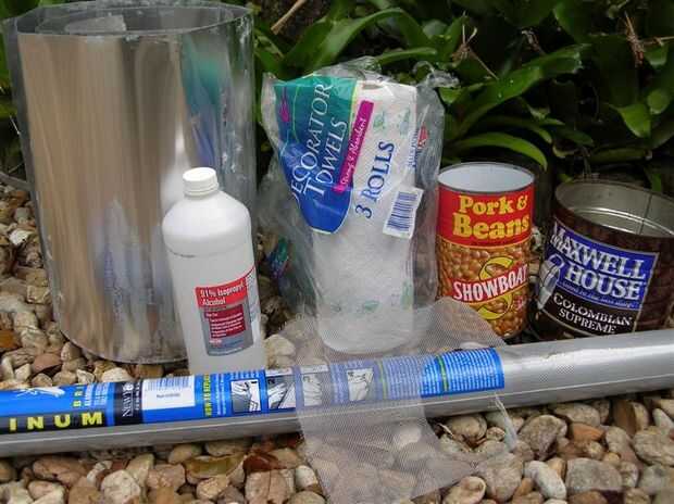 A continuación necesitarás alguna pantalla de puerta de aluminio. Las dimensiones de tanto la hoja de aluminio y la pantalla de aluminio así como el número de piezas es el mismo. Tendrá dimensiones suficientemente grandes como para cortar círculos de aproximadamente 1/16" a 1/8" mayor que el bote en que va a hervir el agua. Para una sartén tendrá dimensiones que son la mitad del diámetro de la sartén. Utilicé unas tijeras de cocina para cortar la pantalla y la hoja.