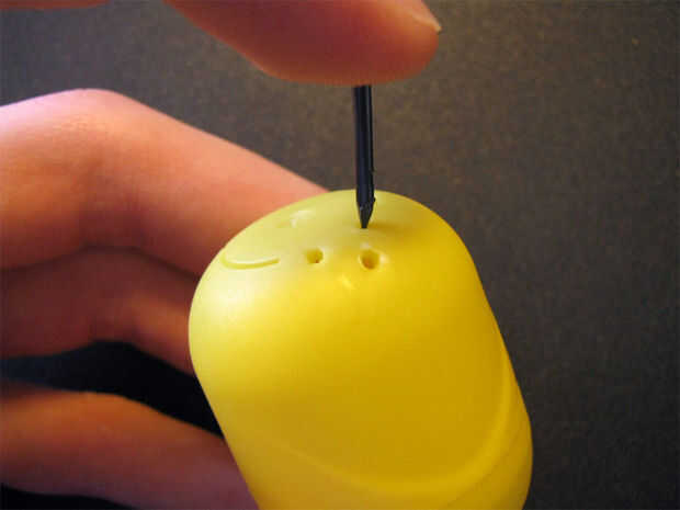 Empezar preparando los agujeros para las piernas, el LED y las antenas. Cuidadosamente empuja el clavo a través de los puntos deseados y había ensanchado los agujeros un poco con la lima redonda. No ensanchar los dos antena diminutos orificios, como el núcleo de los dos cables pequeños debe ser lo único que cabe por.