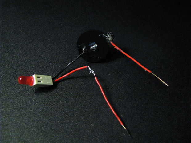 Soldar el soporte LED, los dos pequeños cables y soporte de la batería (si tienes uno) como se muestra arriba. Si el cable que viene del soporte del LED es algo tieso y no un cable trenzado, puede ahorrar el pequeño alambre de la segunda.