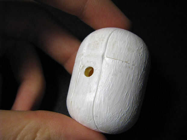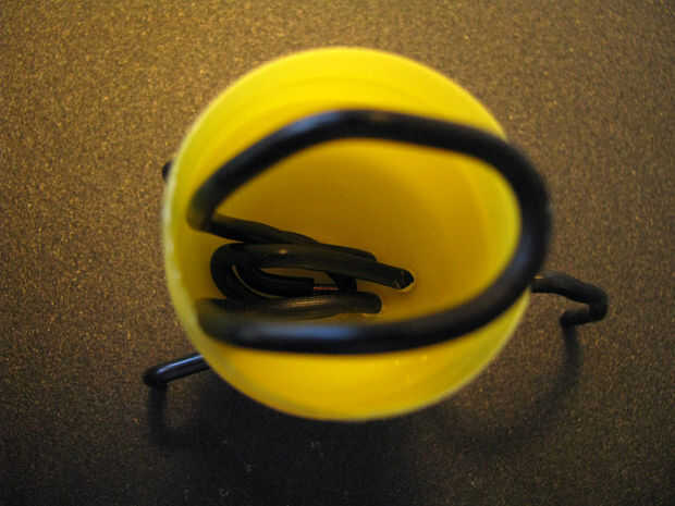 Empuje el lado no spirraled de la pierna trasera del interior de la torreta a través del orificio correspondiente al exterior. Garantizar la espiral en el centro de la parte inferior de la torreta, luego empuje ambas patas delanteras a través de sus orificios (otra vez, desde el interior hacia el exterior). Estimación de la cantidad del cable puede empujar para salir del bucle en la parte superior del huevo si está cerrada.