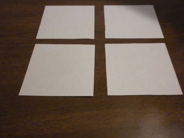 Este paso es para cortar el papel de las "pegatinas". Cortar 4 cuadrados amarillo, 4 blanco, 2 naranja, 2 rojo, 2 verde y azul 2. Cortar cada cuadrado de modo que son 3,5 pulgadas en cada borde.