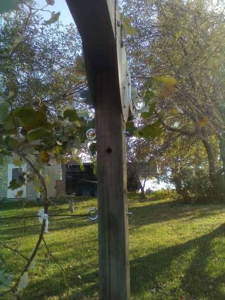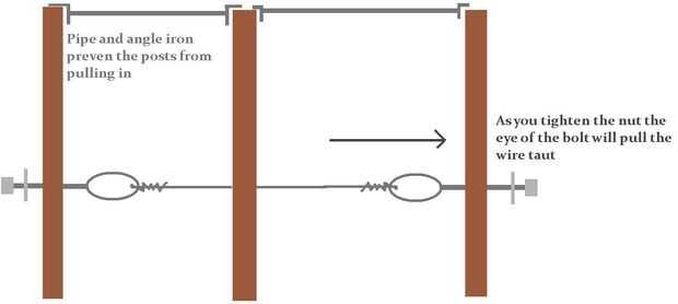Ahora puede volver loco y apriete las tuercas que apriete los pernos de ojo. El alambre se va desplazando y causar los puestos a los pies un poco en. Esta presión impide la abrazadera de la pipa y el ángulo va a ninguna parte y evitará que tus vides caída una vez que empiezan a poner su peso completo en los cables.