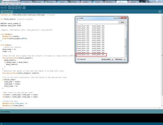 Para adquirir la señal escribí un código para el arduino (atmega8) leer la señal de servo que utiliza el receptor. Simplemente cuenta cada x segundos mientras que la señal está en la lógica de nivel alto (5v). Es la señal de servo en la figura 2, el nivel en que puede ser de 1 ms a 2 ms cada 20 ms. ahora conocer los valores de la señal y puede utilizarlo para controlar el motor. Fig 3 muestra la adquisición valores de cuenta de proceso y el max y min. Puede descargar el archivo signal_tests.pde en este post para la adquisición de la señal de la prueba.