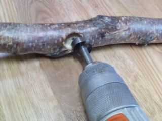 Esas dos piezas mediados el centro agujeros espigas [no demasiado profundo debilitará la silla final], alrededor del centro son donde van [no demostrado] el final cinta o cadena a la parte inferior del respaldo y el respaldo de la silla. Quiero que mi silla acabado para mostrar tanta cinta o cuerda lo que decido terminarlo como sea posible. Es por eso que ambos orificios están cercanas de aquí, uno es la parte inferior del respaldo, uno es el fondo del asiento hacia atrás. Afeitó el boquete en el medio para asegurarse de que mi cinta de la cuerda de seagrass cabrán a través de esa brecha. Luego escondió la parte afeitada por lo que se enfrentan entre sí.
