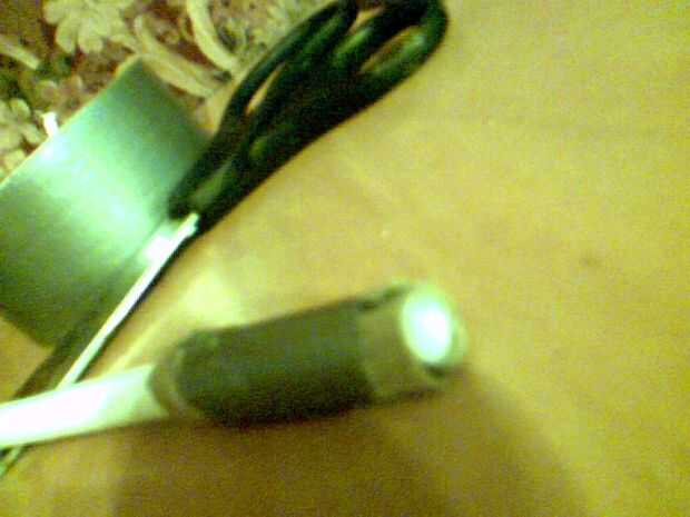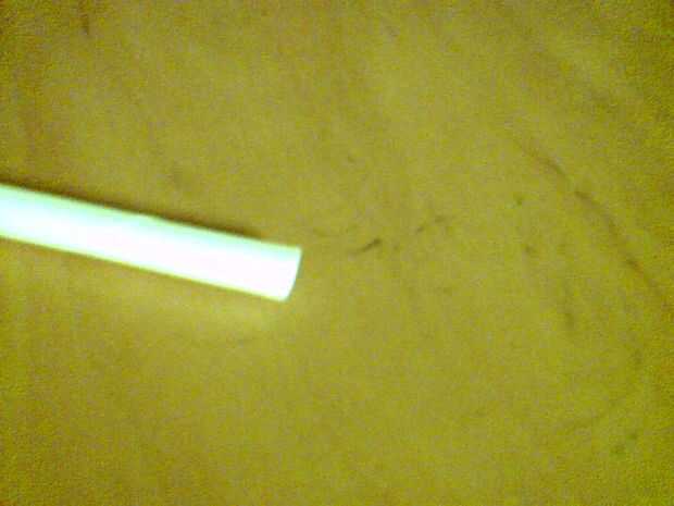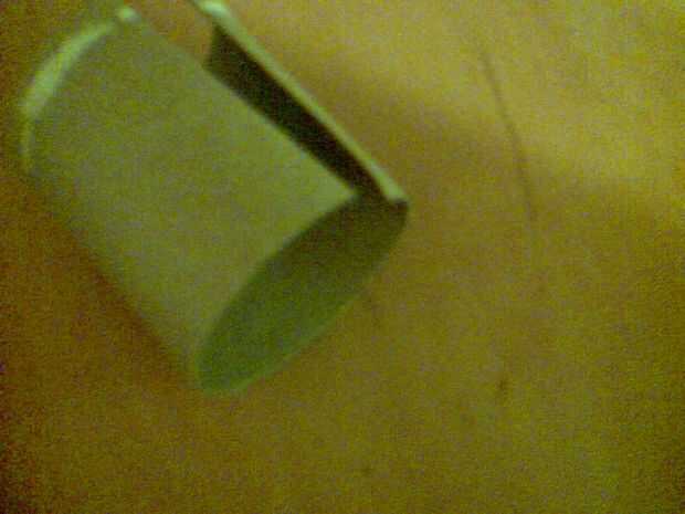 Ahora cortar la parte inferior de la varilla recta todo lo que es plana en la parte inferior. Corte el tubo de cartón por la mitad (como se muestra en la imagen). Rollo de la cartulina para que encaje perfectamente en la parte inferior de la varilla. Cinta de cartón y luego fije a la parte inferior del tubo para que el papel va todo el camino dentro de la cartulina. No deje cartón extra en el final.
