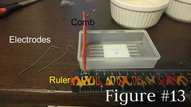 1. Asegúrese de que usted ha hecho la cámara de gel, peine, solución amortiguadora y agar gel antes de pasar a este conjunto de instrucciones. (Figura #12)
