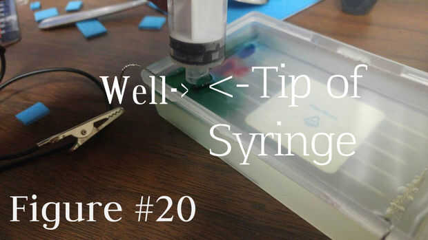 2. en primer lugar, llene la jeringa de plástico con colorante rojo. Depositar el colorante rojo en el pozo más lejano lejos de usted.