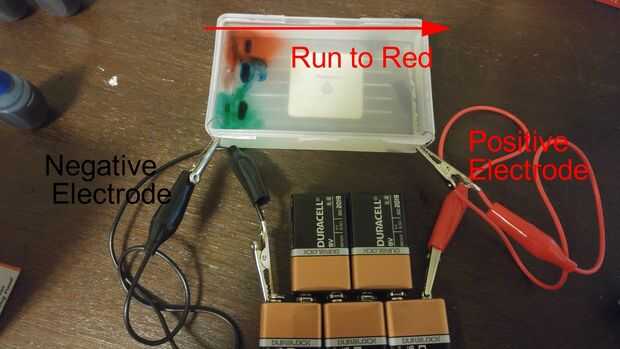 10. el colorante se migrará desde el lado de la cámara con el electrodo negativo hasta el final con el electrodo positivo.