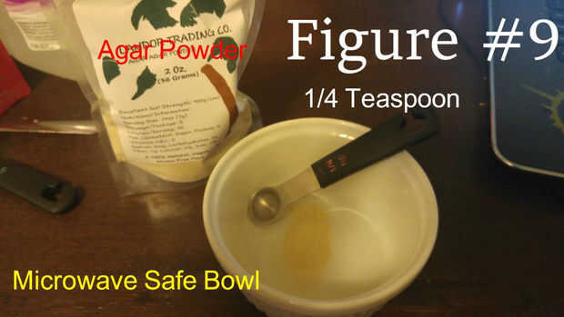 1. Coloque 1/4 de cucharadita de polvo de agar en el recipiente de microondas seguro.