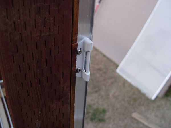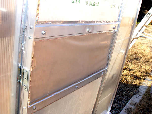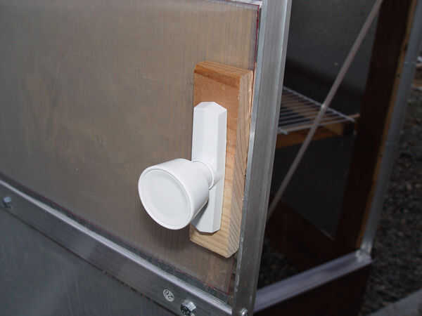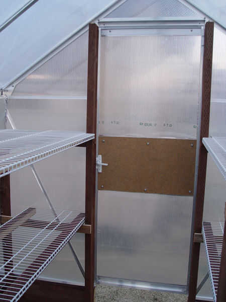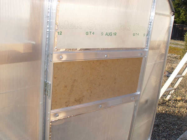 Para enganchar la puerta puede usar casi cualquier hardware de la puerta de pantalla de tormenta disponibles en los centros de origen (Lowes, Home Depot etc..). Me ha pasado a utilizar productos de Wright modelo #V670WH que cuesta alrededor de $10. La puerta del invernadero de HF es mucho más delgada que pantallas normales o tormentas para un 3/4" redwood espaciador fue corte, taladrado y montado detrás de la perilla de la puerta. El interior manija montada como proporcionan las direcciones. El cierre está atornillado al marco de aluminio con tornillos de #8 y tuercas. La puerta completa se muestra en las fotos del exterior y el interior.