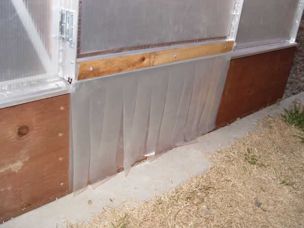 Desde la puerta nueva se sienta 12" mayor de la tierra que la original, tenemos una brecha bastante grande, abierta en la parte inferior de la puerta.  Queremos ventilación de todos modos, para que esta brecha se cubre con dos capas de película de 6 mil UV.   La película es la raja aproximadamente cada 3 pulgadas y las ranuras se compensan para reducir el flujo de aire.