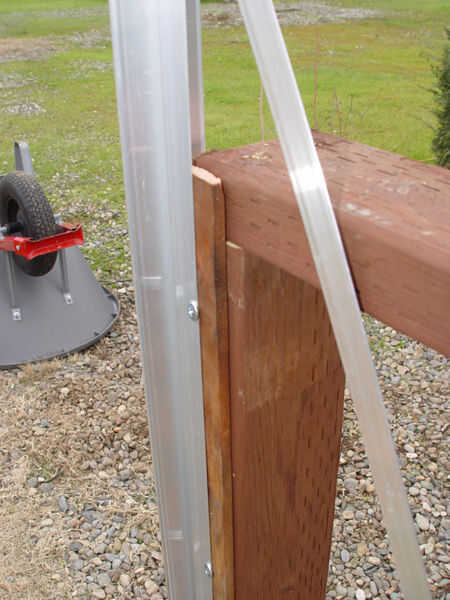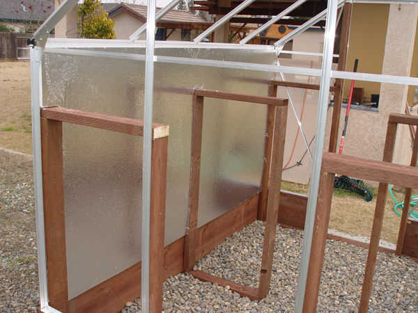 A) ahora puede comenzar a montar las piezas de la estructura de aluminio siguiendo las instrucciones en el kit de efecto invernadero.   El piezas se sujetan en los varios puntos a la 2 x 4 Banco/estantería estructura con 1" de aluminio redonda tornillos para estabilizar el marco. Para mantener las piezas de aluminio madera cuadrada y vertical, se utilizan espaciadores entre la estructura de 2 x 4 y el marco de aluminio.   En su mayor parte, listones de redwood de pulgadas de trimestre (también conocido como tablero de bender) se pueden utilizar para esta tarea.  Deberá cortar los espaciadores para hacer un ajuste más exacto en algunas situaciones.  Una vez se completa el marco de aluminio y todos los componentes estén en escuadra y plomada, se puede permanentemente Coloque las cuatro piezas de aluminio base (#s 16,17,34 y 34) en los travesaños de 2 x 12 con tornillos de 1".