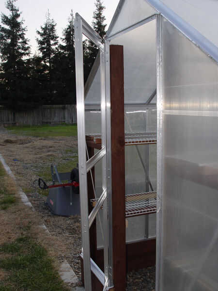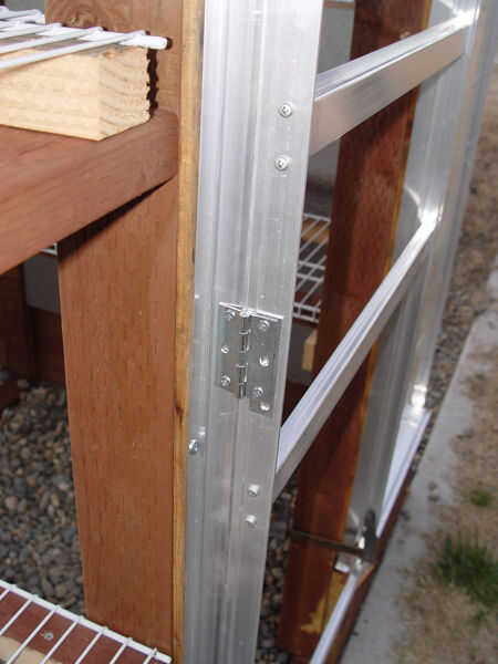 Si ya los instalaste, quitar temporalmente los paneles de policarbonato que son a la izquierda y derecha de la abertura de la puerta para darse un margen de trabajo. La Plaza de la puerta de la posición en la estructura de puerta de aluminio y fijarlo con la abrazadera en su lugar. Asegúrese de que la parte inferior de la puerta es incluso con la parte inferior de las piezas laterales de estructura (#s 6 y 7) para asegurarse de se abra y cierre correctamente. Las bisagras del oscilación son contra la parte exterior del marco de aluminio alrededor de la abertura de la puerta. Utilizando los orificios de la bisagra como guía, perfore agujeros a través del marco. En mi instalación, las bisagras no echasteis bastante plana contra la estructura. Y si instalas a un espaciador detrás de la bisagra puede interferir con la instalación del panel de policarbonato. Simplemente dejé este pequeño ángulo en la instalación de las bisagras y las obras de la puerta fina. Coloque las bisagras con tornillos de #8 y tuercas. Después de todas las bisagras se atornillan encima, prueba de la puerta para asegurar bascule libremente y queda alineado con el marco circundante.