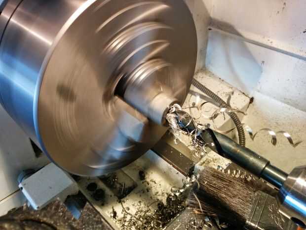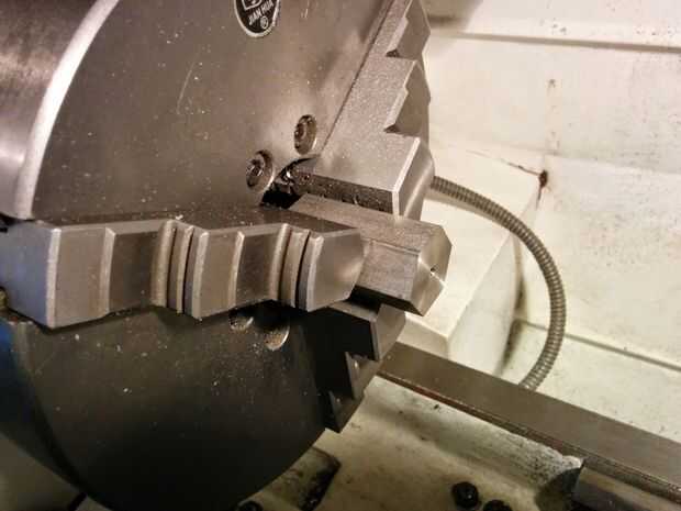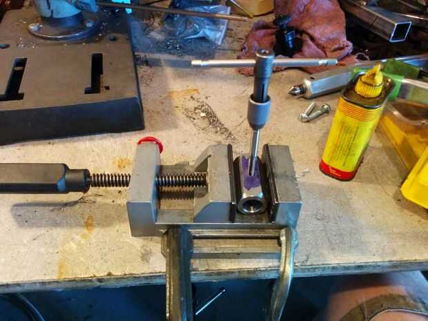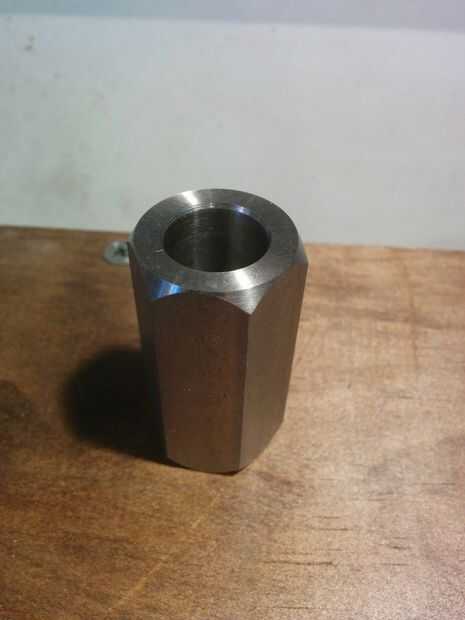 He encontrado un trozo de 2" de 1" de acero inoxidable hexagonal stock en mi cubo de chatarra. Completamente overkill, pero no pudimos resistir usarlo. Me tiraron en mi torno y perforados hacia fuera primero a 1/4" y luego a 5/8", que era el diámetro de la pluma. También tuve que agujerea hacia fuera a un par sobre, para conseguir un deslizamiento agradable forma. Finalmente biselado a los bordes porque pude, y creo que biselado hexagonal es una de las cosas más bonitas alrededor.