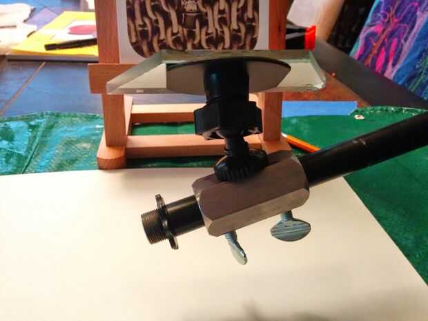 Tomé prestado un soporte de micrófono de mi compañero de cuarto que inmediatamente resolver la mayoría de los problemas del brazo anterior. Era sólida y puede ser ajustado fácilmente. Todo lo que se necesitaba era una forma de montar el espejo en el extremo de la pluma. Encontré un soporte de cámara en línea con una placa adhesiva para que el espejo podría ser pegado. Perfecto! Al otro lado había una cámara de 1/4"-20 estándar montaje de tornillo, así que todo lo que se necesitaba era una manga que podría ser fijada con abrazadera firmemente al brazo del micrófono con un agujero roscado de 1/4"-20 de un lado.