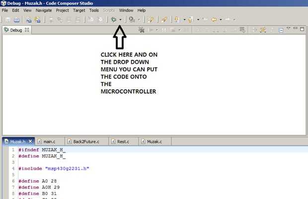 Usted necesitará instalar studio código compositor para el MSP430 para cargar códigos a él. Especificar una carpeta que se desea trabajar en y comenzar un nuevo proyecto llamado Muzak. Siga las instrucciones que viene con el MSP430 hacerlo. Una vez que tenga código compositor Studio, descargar estos archivos o copiar y pegar su código (esto requerirá abrir el archivo .rar): http://www.mediafire.com/?oogn9t59vvk4p2b
