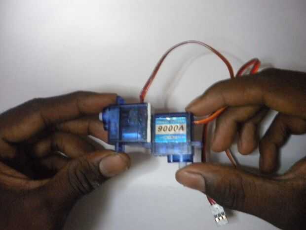 Así que el primer paso es colocar un doble cinta de lado a la parte posterior del motor Servo primer. Luego conecte el segundo motor de servo el servo primera de tal manera que el eje motor del segundo motor debe mirar hacia abajo se refieren a la imagen de arriba.