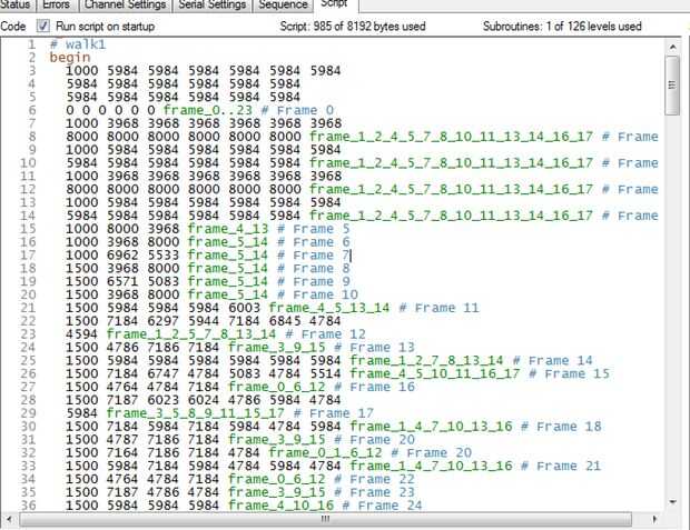 Después de tomar precauciones de crear marcos y arreglar el ángulo de los servos según una línea de tiempo. Lo verás en tiempo real. Entonces crea tu historia de movimiento y desplegar el código creado por el programa en el controlador de servos de tu hexápodo. Ver mi código en el cuadro. Fue creado por el programa.