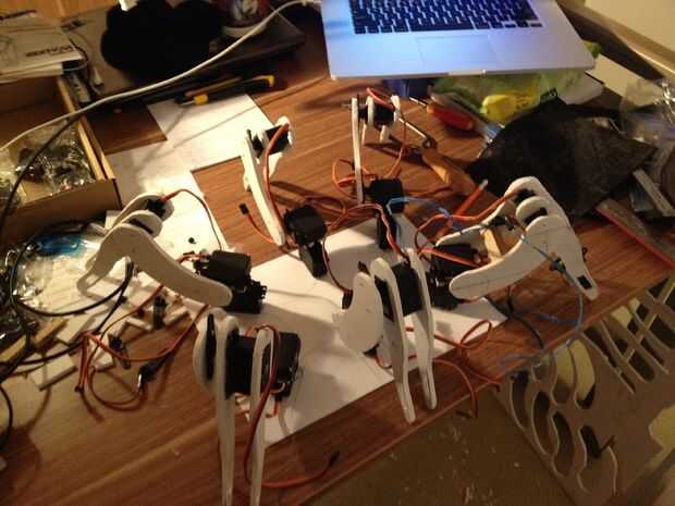 Por supuesto deben preparar seis piernas :) En la fotografía puedes ver seis patas. Pero hay servos en cada uno. ¿Qué? No te preocupes. Se llego a ese punto en los siguientes pasos. Basta con crear las piernas con un servos.