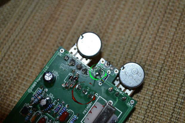 Bien tan realmente entrar en la parte de los botes y el interruptor de encendido, voltee la placa de circuito para que la parte inferior (donde has hecho la soldadura) es hacia arriba. Poner las macetas, LED y de interruptor en el tablero de este cirtcuit. Estos componentes se sueldan en la parte superior de la Junta. Sin embargo, no suelde hasta que quede todo alineado correctamente e inserta a través de la caja para el pedal. Atornillar los componentes para que sean seguros cuando vaya a soldar. Mantener todo recto y uniforme. Que tenga que sujetar la placa de circuito para mantenerla recta.