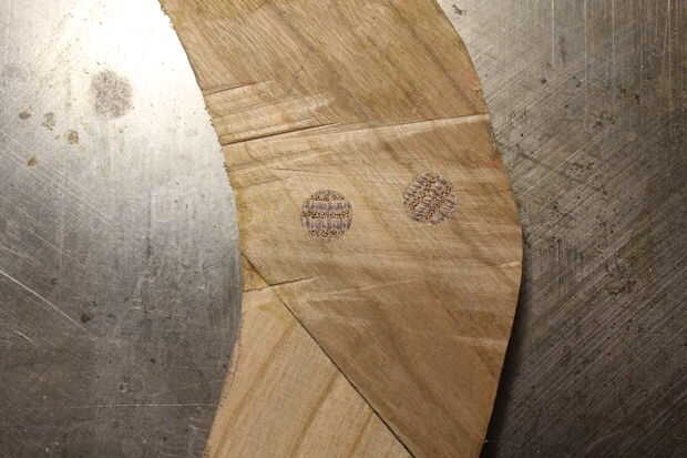 Ahora mirar en internet para su perfecta forma de Boomerang, dibujar hacia abajo y cortar con una sierra de cinta! Eso es él! Luego debe parecerse un poco esto. Su no hay problema si no cortan 100% en su línea, porque se podrá lijar más adelante :) Perforé dos agujeros en el centro y un palo de madera en ella, es para más estabilidad y fuerza, pero también sólo para una mejor óptica.