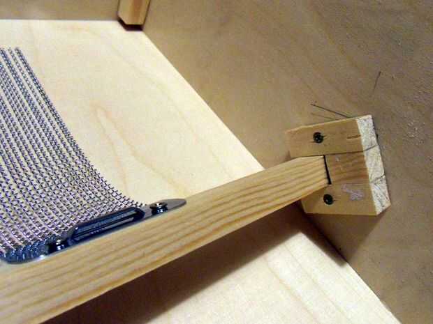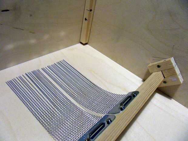 Así que utiliza un largo bloque rectangular de madera y fija con dos madera ' u's como se puede ver en la imagen. Ajustando la altura y el ángulo que las trampas toquen la parte frontal interior pude ajustar el sonido de las trampas.