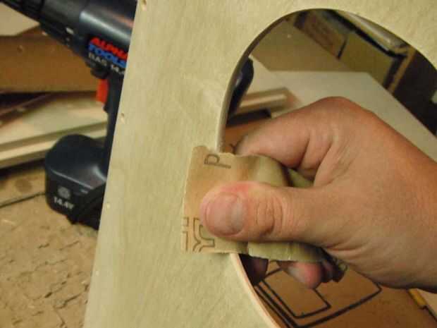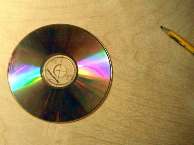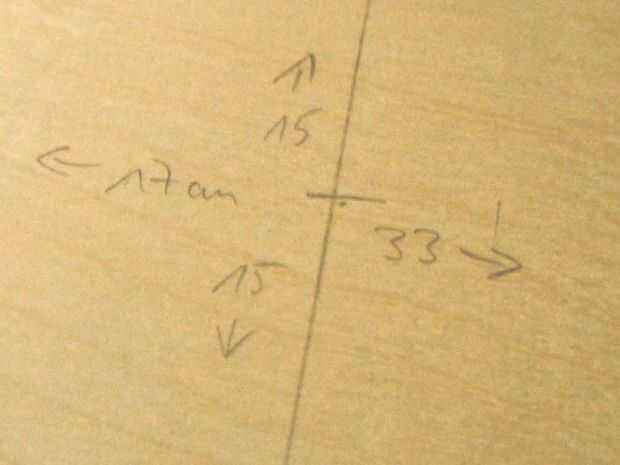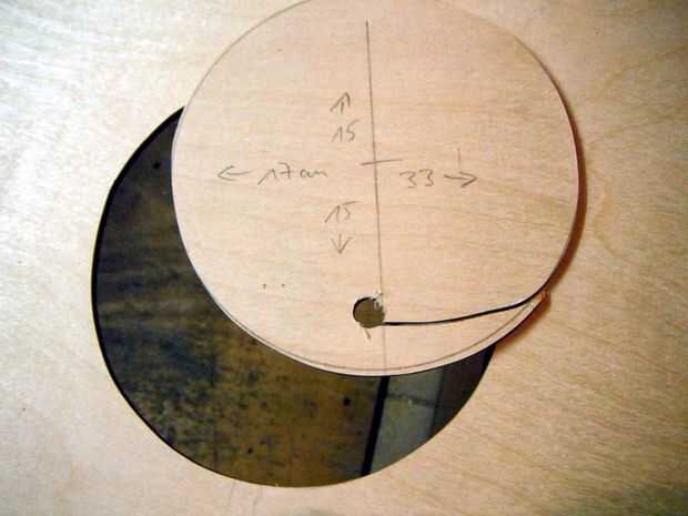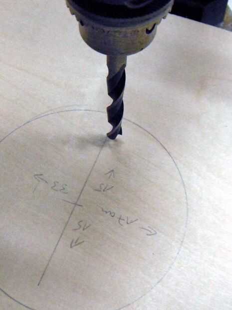 Ahora toma la trasera y marcar el círculo de la boca. Decidí colocar a 2/3 de la altura. El tamaño exacto y la posición no importa demasiado. Sólo tratar de conseguir un look armónicamente. Para mí el centro del agujero era 15cm de cada lado y 17cm desde la parte superior. Pues yo utilizaba y CD viejos para dibujar un círculo perfecto antes de cortar con la sierra caladora.