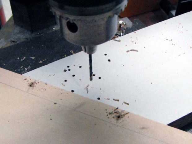 Ahora es el momento para perforar el frente y parte trasera. La parte delantera inferior se pega al marco, por lo que no necesita ningún agujero aquí. La parte trasera está completamente atornillada. De esta manera usted puede abrir para el servicio. ;-)