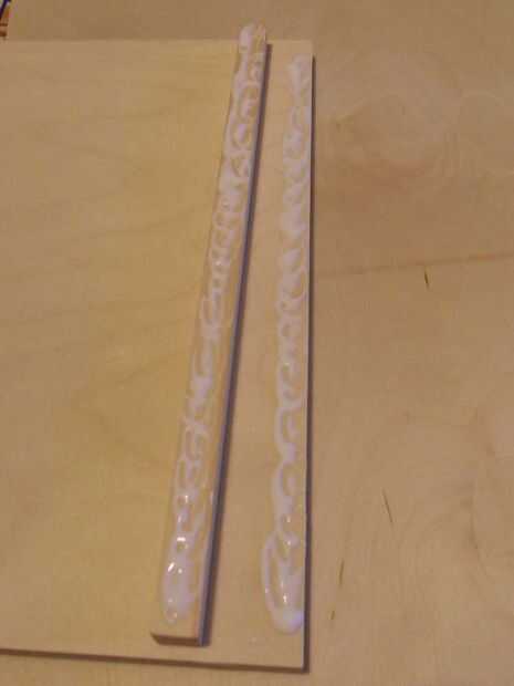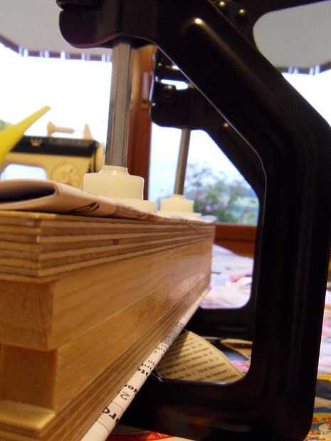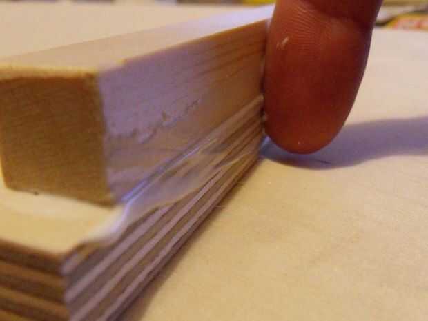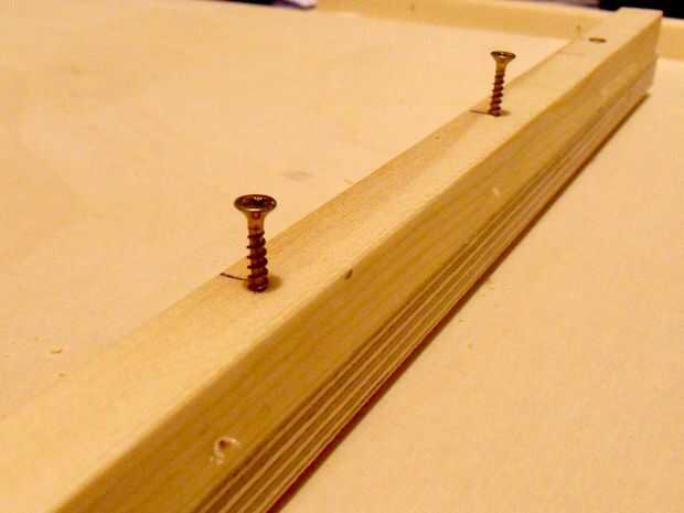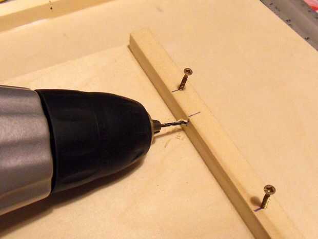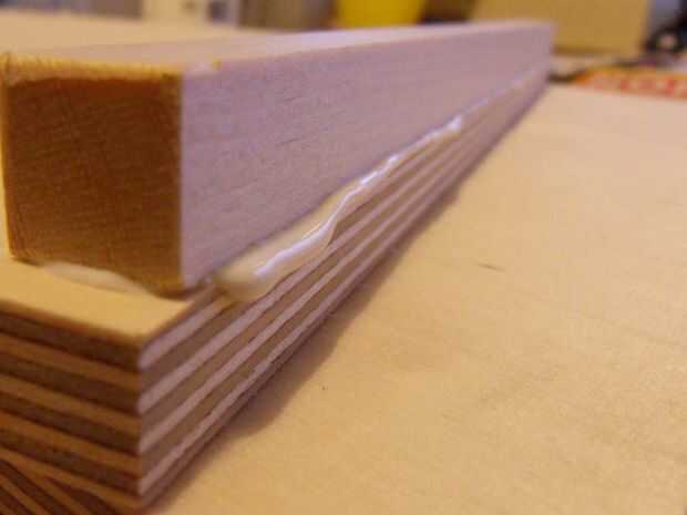 Después de que el pegamento se seca puede 3 taladros en el bloque rectangular de madera y algunos de los tornillos largos (2.5x20) tornillo interior. Si tiene sólo 10mm de multiplex y bloques de 10 m m, usted debe tomar solamente tornillos de 16mm! También tenga cuidado de no perforar a ahora! El agujero en el complejo no tiene que ser profundo.