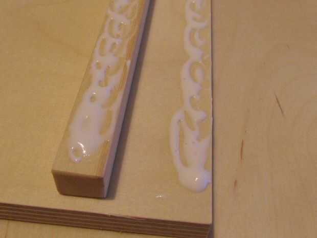 Ahora que todo está preparado, tome los bloques rectangulares de madera y pegar uno de ellos a cada extremo de las piezas del lado largo. Es muy importante que los dos bordes lisa verdadera, como serán el fondo y la parte superior pegado a los lados. Así que primero agregar algún pegamento para madera y deje que se seque durante unos minutos. No utilice demasiado pegamento, ya que esto hará que las dos partes a nadar unos a otros, lo que es difícil de ajustar. Entonces se les juntos y ajuste el borde. Si todo está bien cuidadosamente cierre las abrazaderas y junte las dos partes. El pegamento de madera necesita unas horas seco abajo y mientras que esta vez no tocarlo.