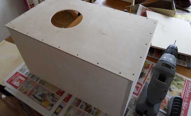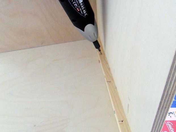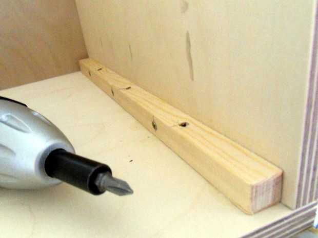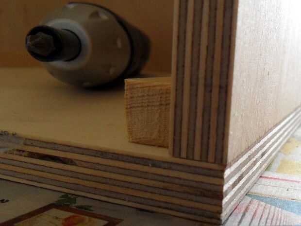 Ahora con cuidado puede poner en el fondo y comienzo atornillar el bloque rectangular interior de madera en la parte inferior.