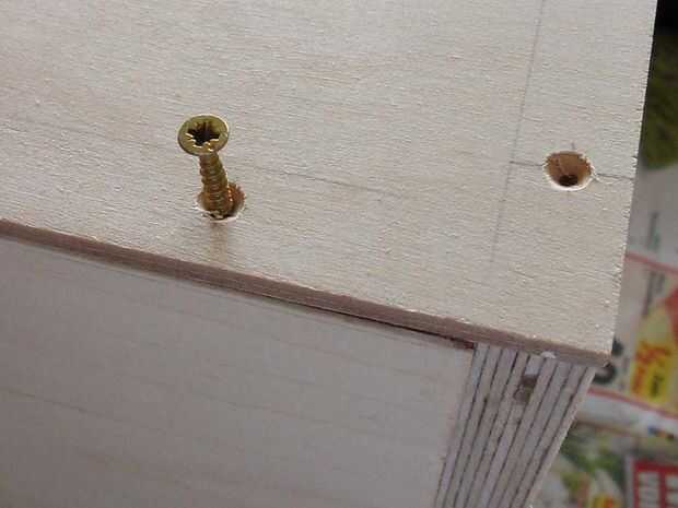 Ajustar las dos partes, que los bordes son muy suaves y luego ponen la parte trasera en la parte superior. Perforar el primer agujero de la parte de atrás un poco en la parte lateral. Recuerda, los tornillos tenían 2,5 mm y el taladro es sólo de 2mm, por lo que hay madera suficiente para dar una buena fuerza.