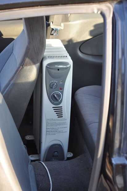 Ya tenía un radiador de aceite eléctrica (120V AC) en su casa. Sólo poner detrás del asiento del pasajero y ejecutar un alargador por la ventana a un temporizador.