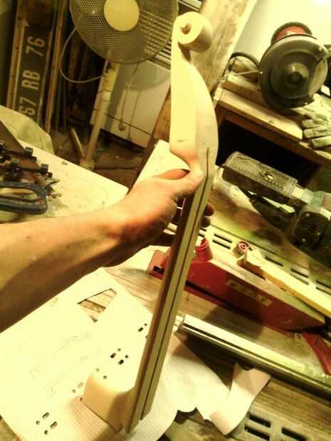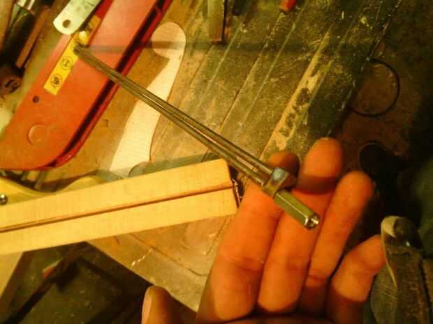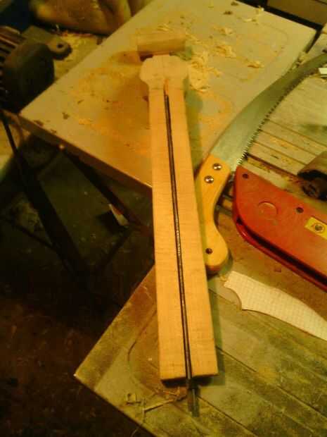 Por último cerrar el cuello con el trusroad en él encolando el diapasón (la tuerca de la carretera de truss será hacia abajo, como en el esquema). Me Consejo para comprar una profesional ya que este trabajo tiene que ser muy preciso (errores pueden hacer que su instrumento nunca bien afinado), o hacer un instrumento sin trastes.