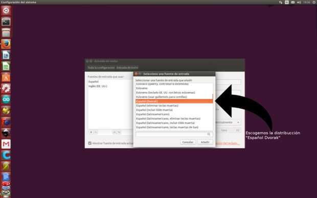 Buscamos en las opciones dentro del teclado en español, en Ubuntu viene preinstalado.