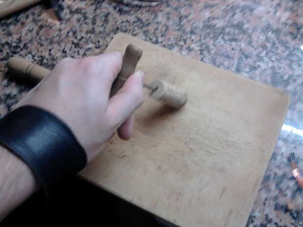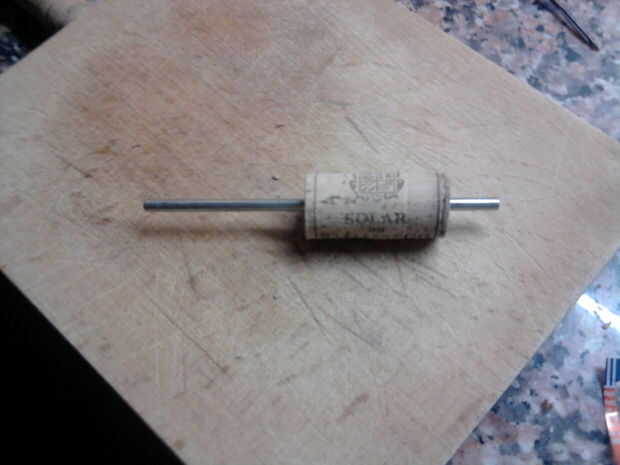 Es importante que este agujero sea mas pequeño el eje, el corcho es flexible y no tendremos problema para introducirlo, pero una vez hecho, el propio corcho se sujetará fuerte al eje por su propio rozamiento.