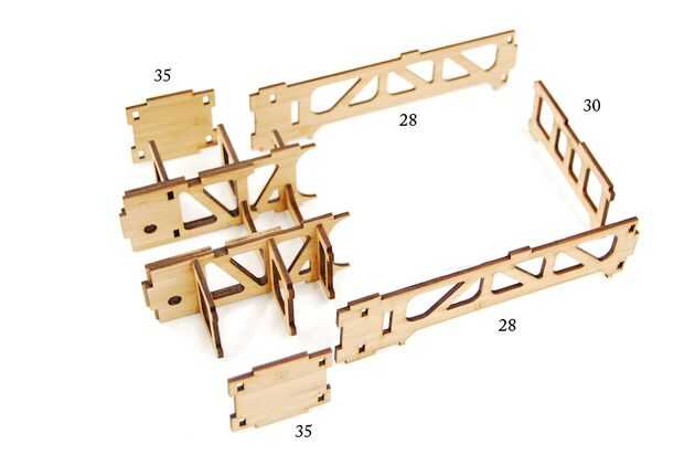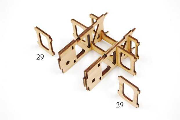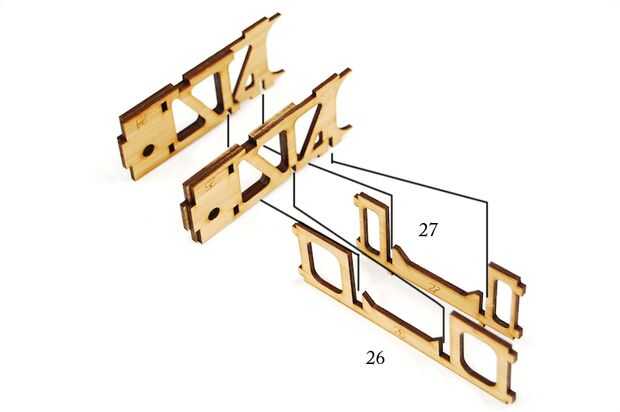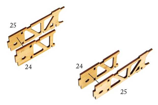 Unir las piezas como se muestra. Es absolutamente necesario que pruebe montar todas las piezas antes de pegarlas les. Tener mucho cuidado con la orientación de las piezas antes de encolarlas; por ejemplo, es fácil accidentalmente la vuelta 24 y 25. Revise dos veces antes de pegar.