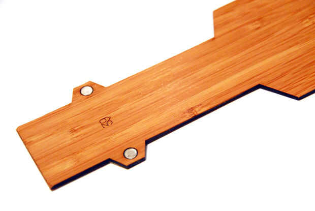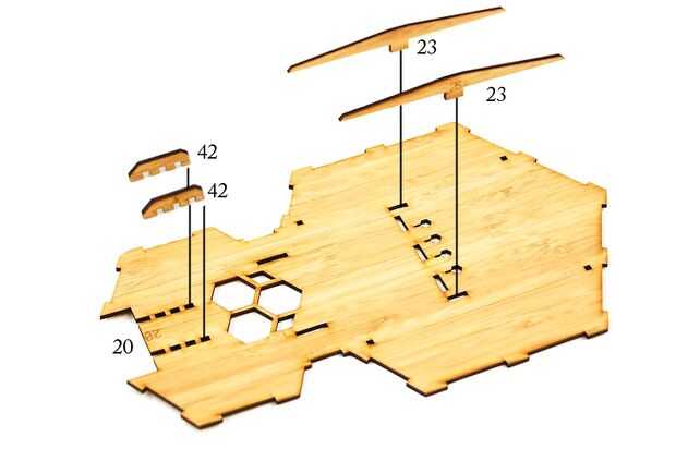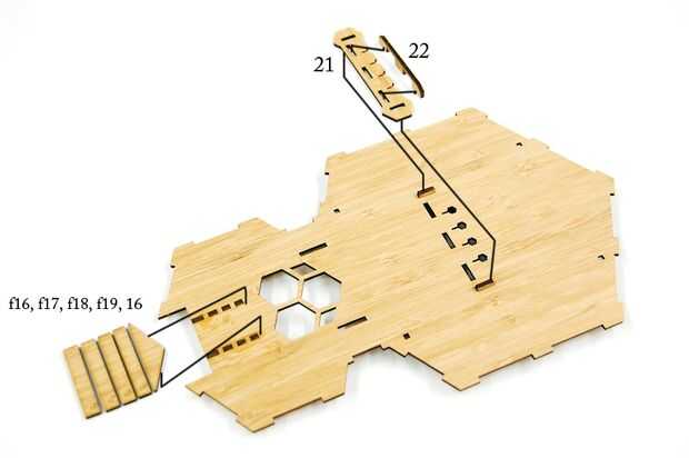 Fije los soportes de traste (parte 42) y refuerzo (parte 23) sobre la tapa armónica (parte 20). Voltee la tapa armónica y armar el puente (las partes 21, 22) y colocar los trastes.
