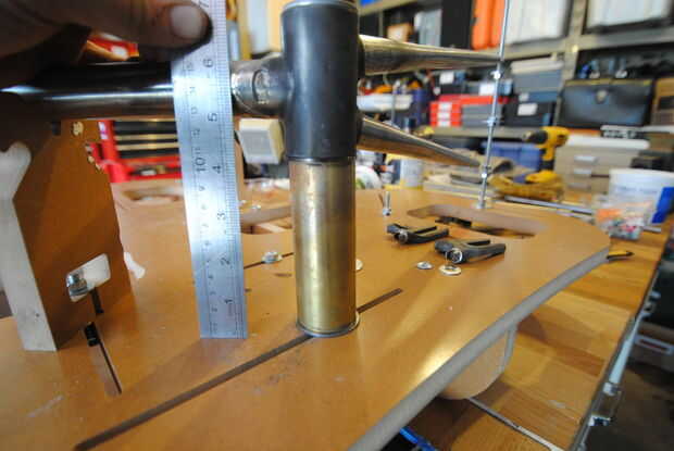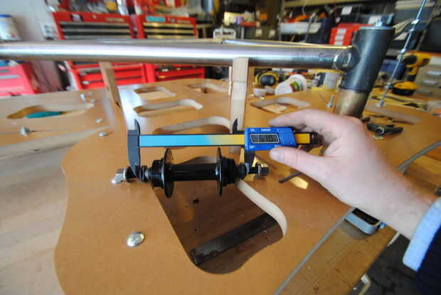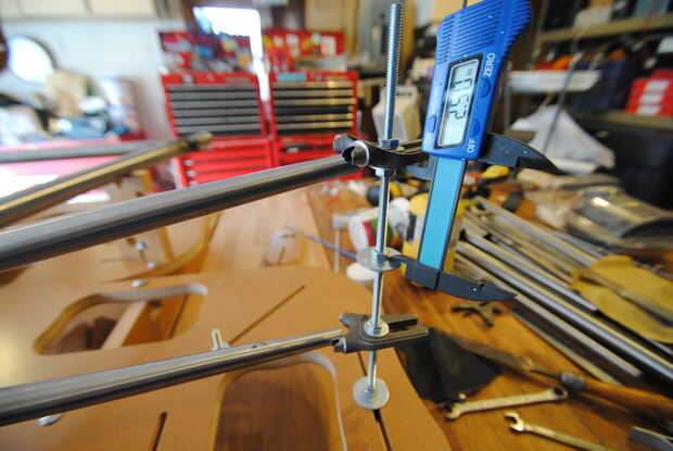En este punto las vainas pueden insertarse en el BB, trazadas e inglete. Las punteras son sobre una varilla roscada y ahora ser cribadas con esta varilla roscada. Asegurándose de que se vuelva a medir todo para asegurarse de que la deserción de espaciamiento es correcta y que todo esté centrado. Con ese conjunto el BB - interfaz CS puede soldarse.